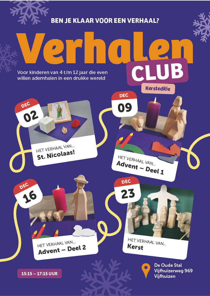 Hartelijk welkom, elke dinsdag in december van 15.30-17.30u. Nel Derks en Annelies Rebel verzorgen de begeleiding. Meer weten over de Verhalenclub of aanmelden? Check de website https://www.pknvijfhuizen.nl/ verhalenclub_ of mail Annelies op verhalenclub@pknvijfhuizen.nl.
